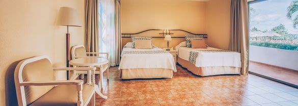 Cette chambre de plain-pied se niche au cœur des jardins de l'hôtel. Elle réserve à ses occupants un séjour douillet dans un environnement charmant. Jusqu'à trois adultes séjournent dans cet espace équipé de deux lits jumeaux ou d'un lit double. Télévision, minibar et machine à café apportent un confort supplémentaire.